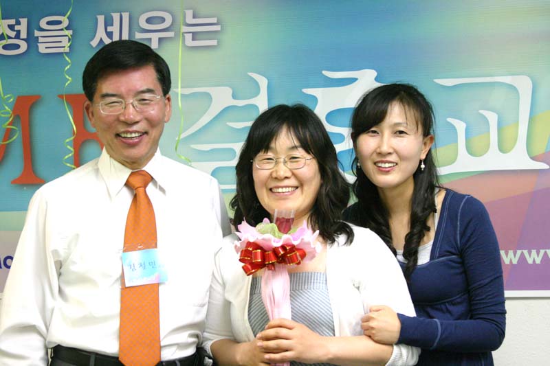 결혼교실을 수강한 박영주 자매가 이번 75기를 졸업하는 Gloria Hwang자매에게 축하의 선물로 준 꽃을 들고 김철민 장로님과 함께 찰칵~