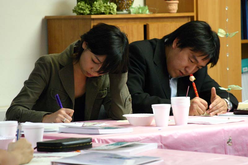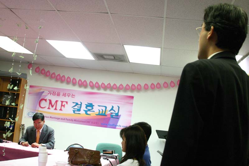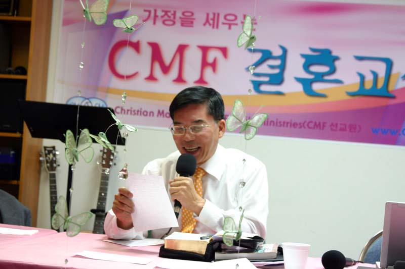 '결혼이란'에 대해 참석자들이 쓴 정의를 읽고 있는 김철민 장로