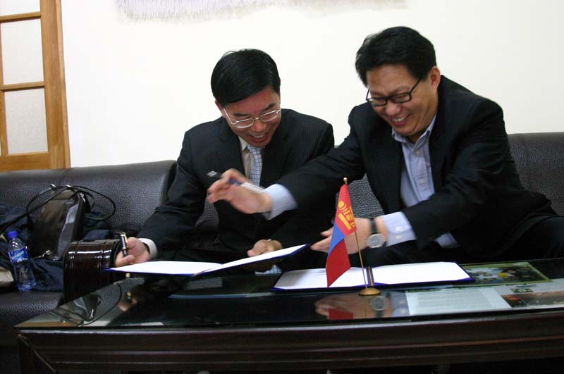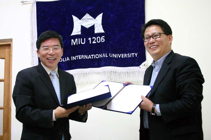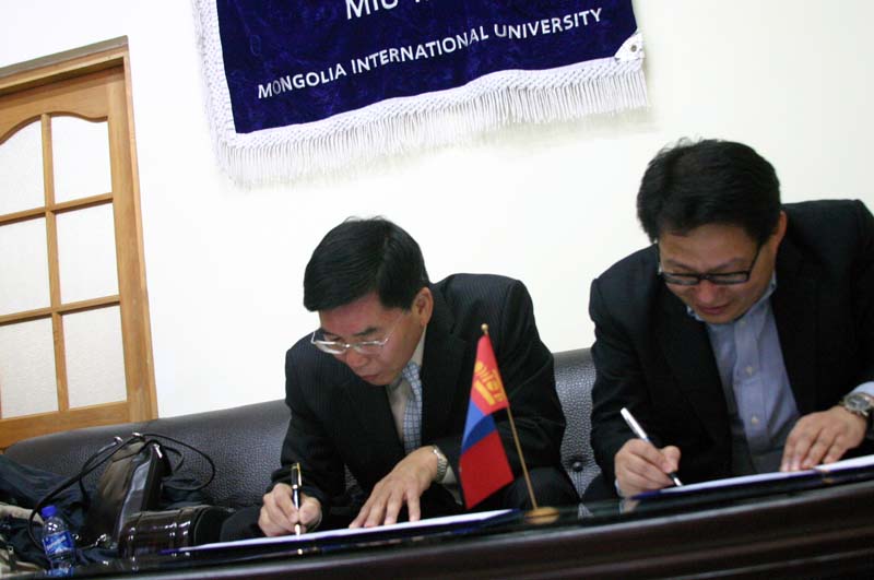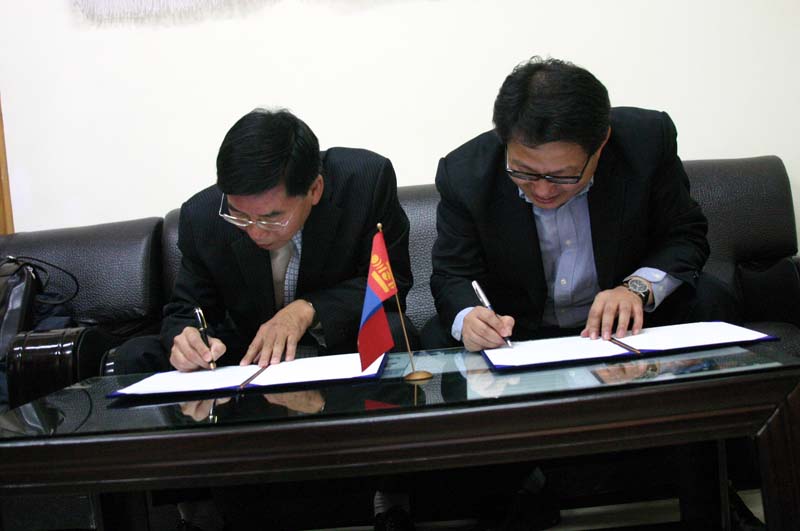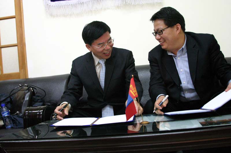 CMF 선교원과(대표 김철민 장로) MIU(몽골국제대학, 대표 권오문 총장) 가 MOU(양해증서)서류에 싸인을 하고 있다