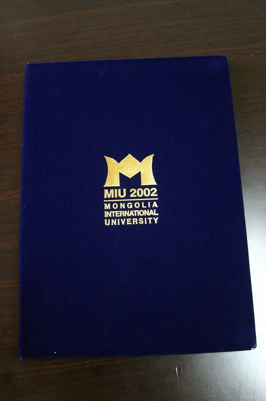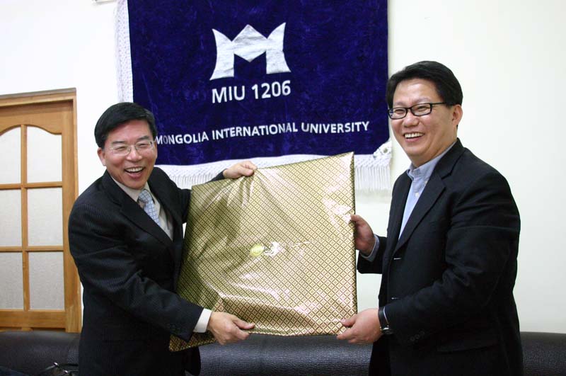 MIU(몽골국제대학)에서 선물을 받고 있는 김철민 장로