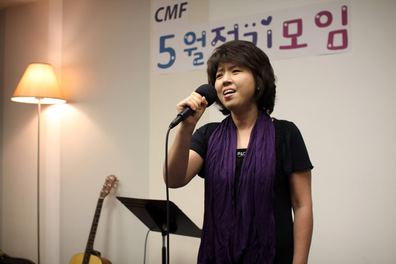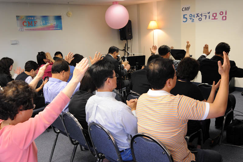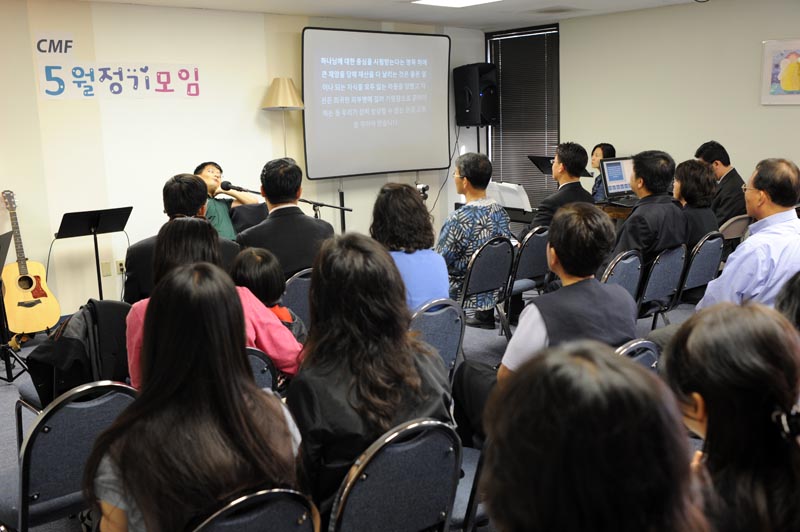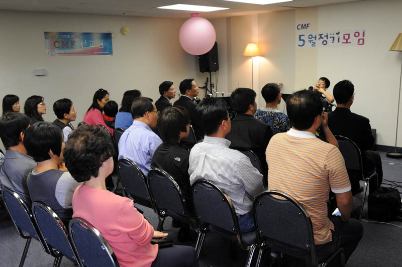 5월 CMF 정기모임이(5-7-2011) 하나님의 크신 은혜로 인한 감동과 도전이 가득하였다. 이준수 목사님께서 욥기서 본문으로 내가 정금같이 나오리라는 말씀으로 모두에게 큰 은혜를 주었고, 이종희 사모님의 찬양을 통해 큰 감동이 가득했으며 오직환 선교사님의 선교보고와 간증을 통해 거룩한 도전이 가득한 시간 시간들 이였었다. 또한 태어나서 한달만에 처음으로 CMF모임에 참석한 김한주는 선교사님 목사님 장로님들로 부터 뜨거운 생명의 기도를 받았다. 갓난아기부터 노인까지 누구나 은혜를 허락하신 우리 하나님께 모든 영광 감사 찬송을 올려드립니다.