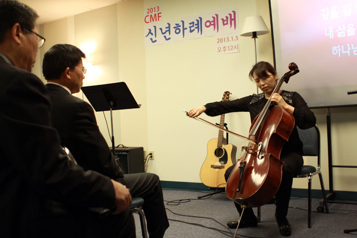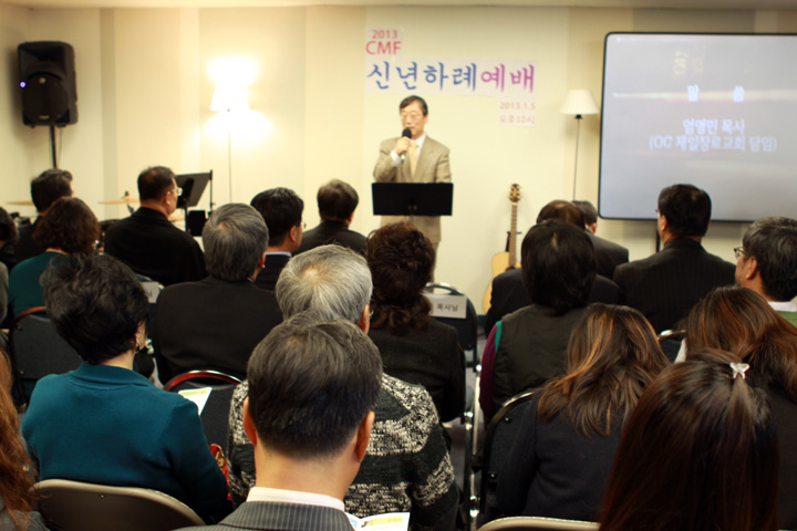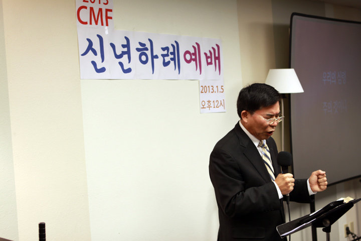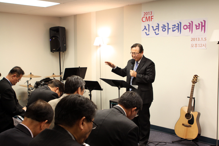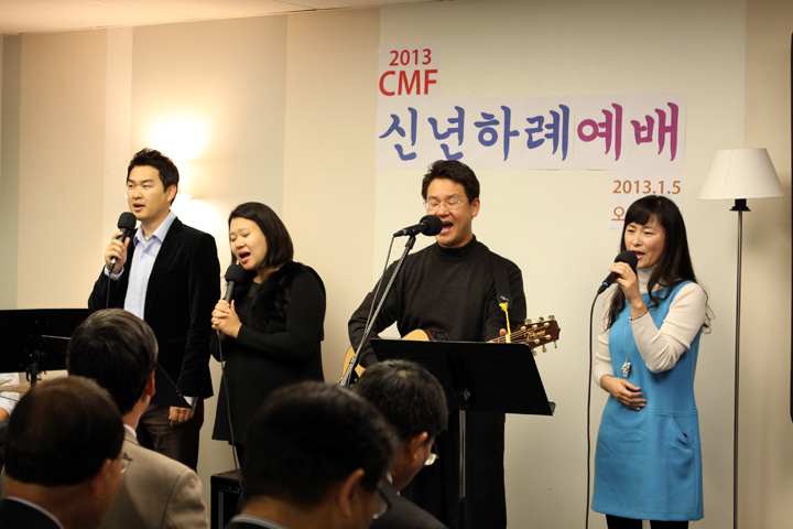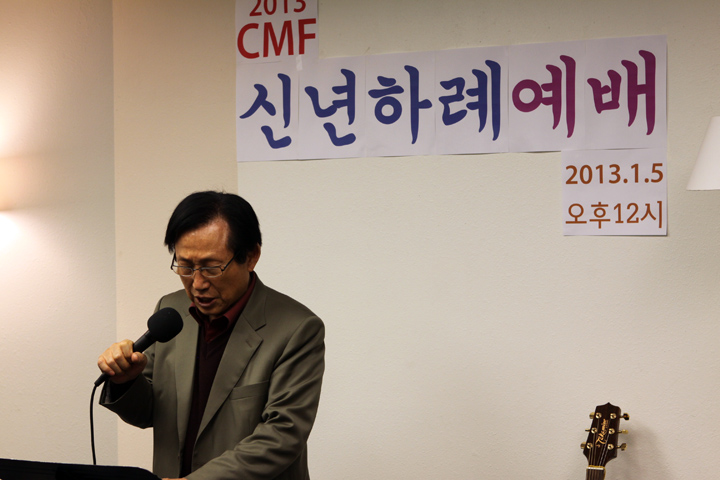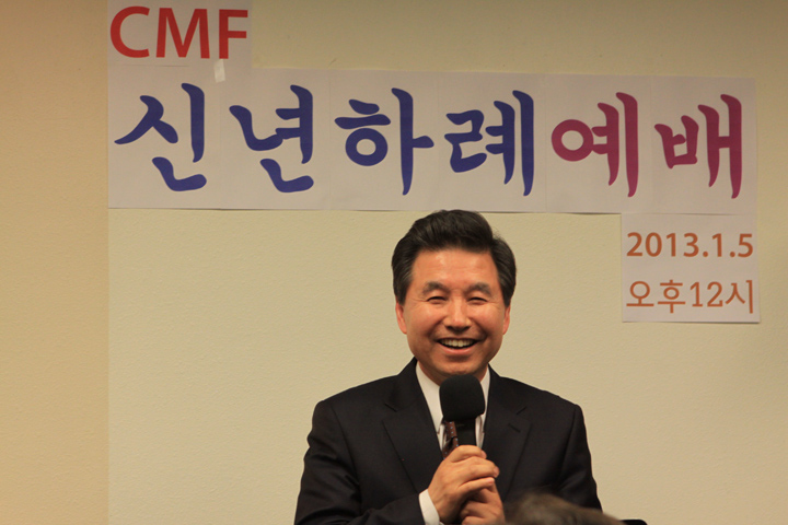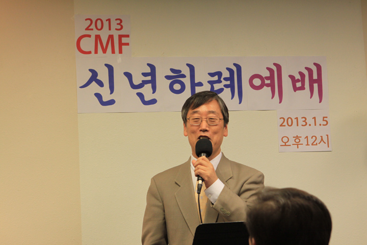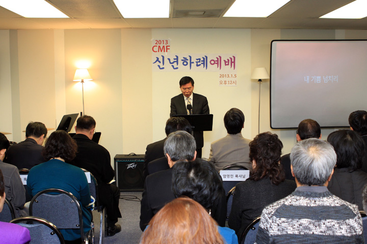 ?2013년도 CMF 신년하례예배가 1월 5일 12시에 CMF회관에서 어린이를 포함하여 100여명이 모여 감사예배를 드렸습니다. 김인철 목사님의 기도와 엄영민목사님의 시편 20장1-5절로 ‘여호와의 승리’라는 제목으로 말씀과 기도와 감사하는 축복의 해로 맡은 사역을 잘 감당하자고 하셨습니다. 연이어 정우성, 박신욱, 강순영 목사님들의 격려사,축사와 축도가 있었습니다.