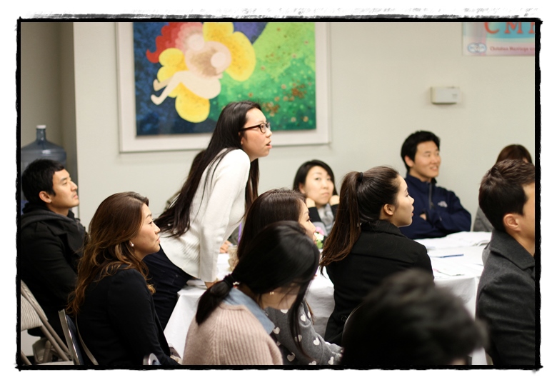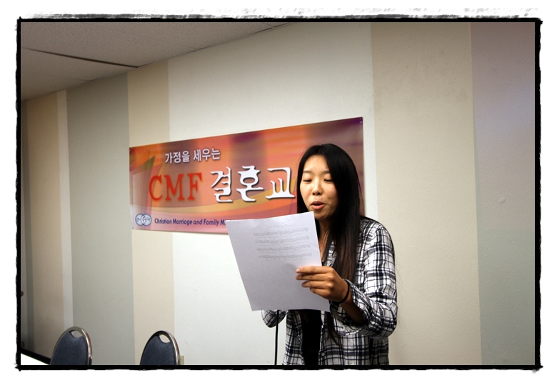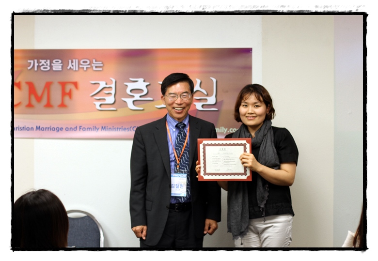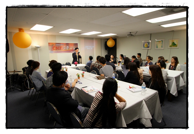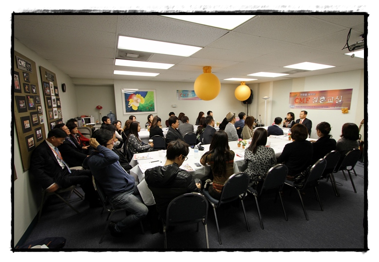 미혼 젊은이를 위한 ‘CMF 결혼교실’이 2월10부터 3월23일까지 매 주일 오후6시-9시 놀웍의 CMF선교원 회관에서 열렸습니다. 결혼교실에는 그리스도인의 결혼 준비, 결혼에 대한 하나님의 목적과 설계, 배우자 선택 및 만남의 원리, 데이트와 성, 사랑의 대화, 비전의 발견 등의 내용으로 강순명 목사님과 자슈아 박 박사, 박수웅 스피브 모리슨 ?유상박?김철민 장로님 그리고 김명자 전도사님의 귀한 강의를 하여주셨습니다. 하나님의 설계하신 결혼제도를 배우고 졸업하신 108기 모든 선남선녀 모두를 축복하고 사랑합니다. 할렐루야 아멘!