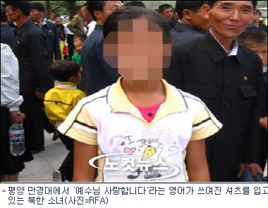 기독교를 인정하지 않는 북한의 평양에서 영어로 '나는 예수님을 사랑합니다'라고 쓰인 옷을 입은 북한 소녀의 사진이 공개돼 관심을 끌고 있다.