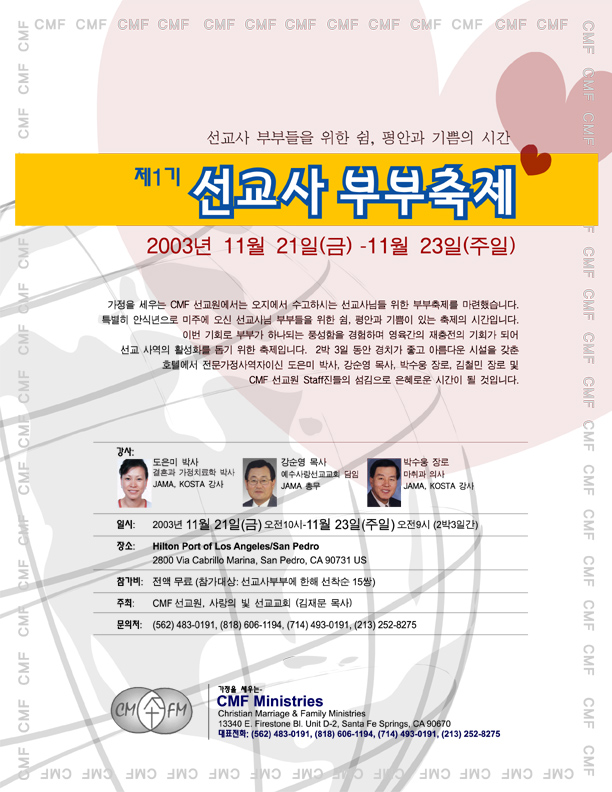 *이의홍 선교사님 사모님은 선교지에서 병을 얻으시고 한국에서 치료중이십니다. 사모님께서 병이 완쾌되셔서 부부축제전까지 미국에 도착할 수 있도록 기도 부탁드립니다.