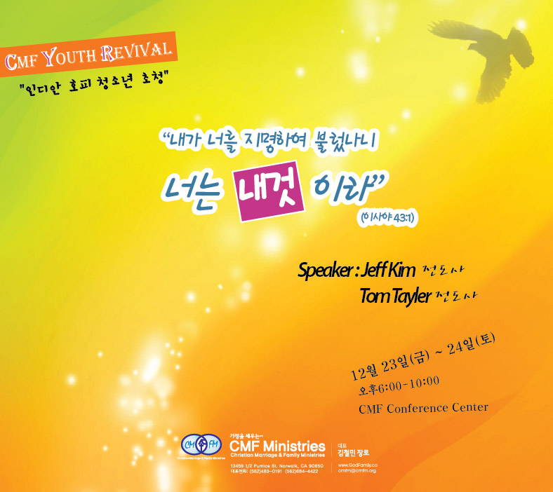 호피인디안 청소년 초청 CMF Youth Revival이 아래와 같이 실시합니다. Andy Woo선교사님이 사역하시는 호피인디안들이 청소년들이 Mission Trip으로 LA로 옵니다. 이들이을 맞이하여 CMF Youth 에서는 청소년 부흥 집회를 개최합니다. 강사는 유럽선교사인 김제프 선교사와 Tome Talor 전도사입니다. 성령충만한 집회가 되도록 중보기도 부탁드립니다.