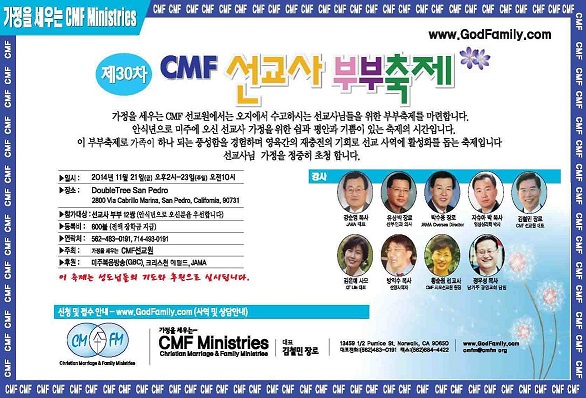 CMF 선교원에서는 쉼과 평안과 기쁨을 갖게되는 제30차 CMF 선교사 부부축제를 11월21일 (금)부터 23일(주일)까지 LA 항구인 San Pedro Double Tree Hotel 에서 2박 3일간 실시합니다.